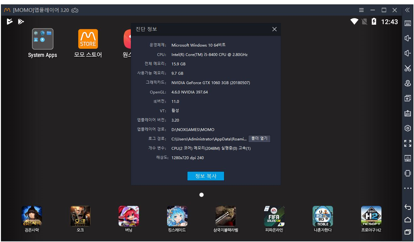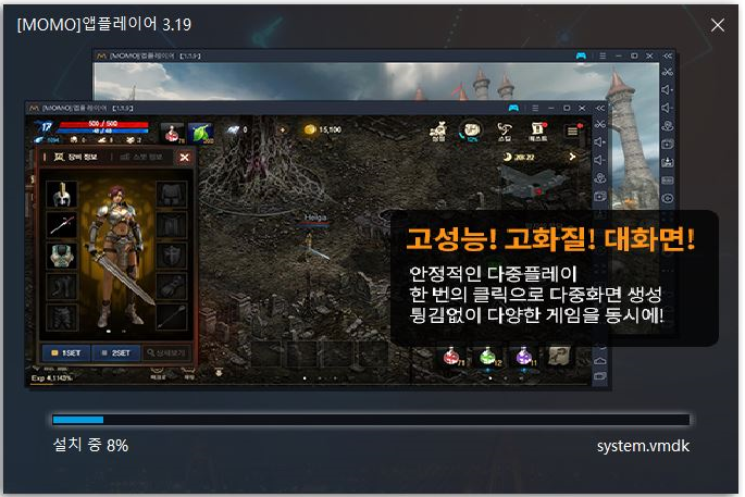 3.20버전의 모모앱플레이어를 다운로드 역시 간단하게 공식페이지를 통해 진행을 해서 문제없이 할 수 있었는데요. 어느정도 pc사양만 맞는다면 고사양의 모바일게임을 플레이하는데 큰 이상이 없을듯 싶습니다.