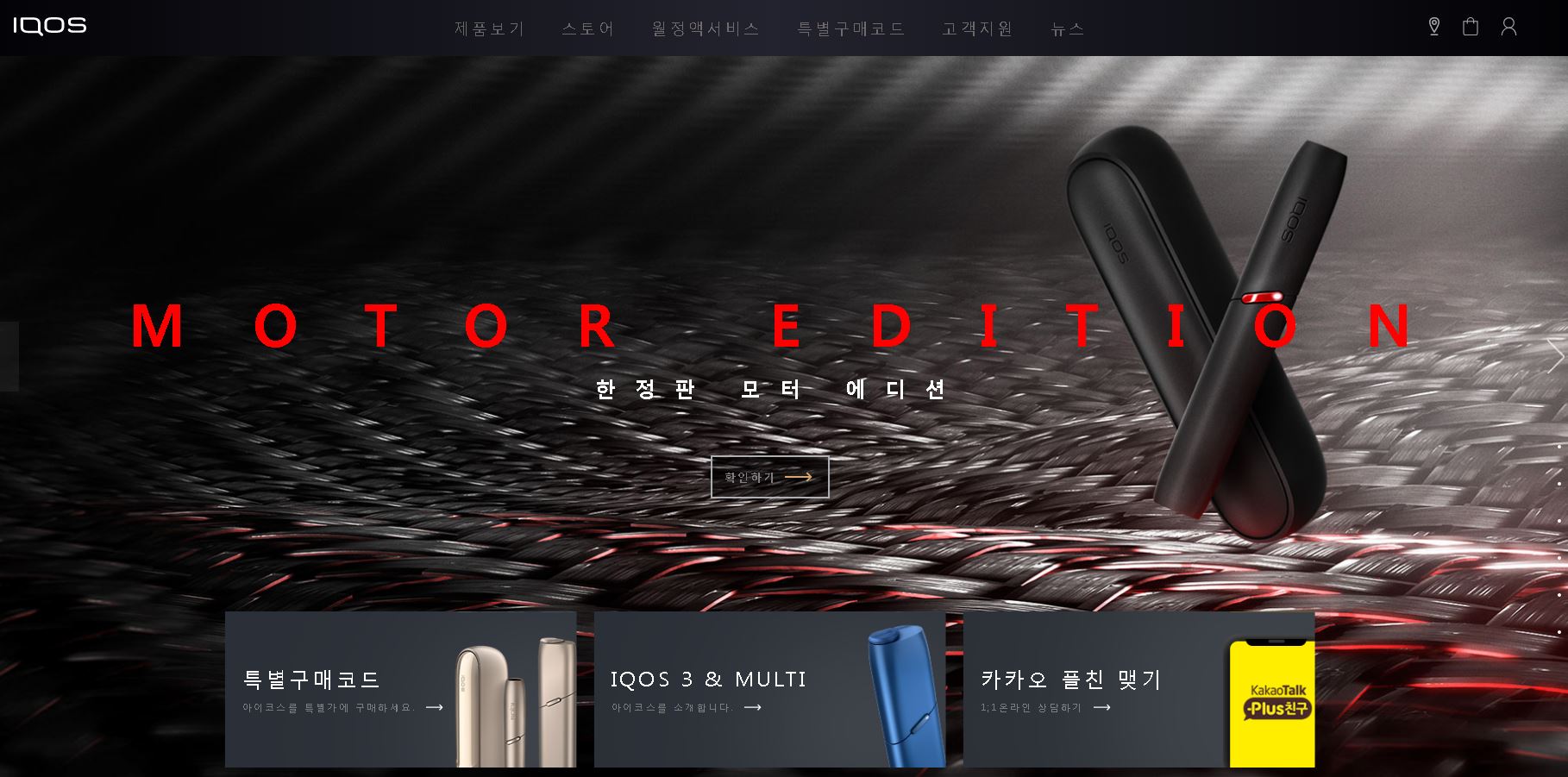 아이코스 홈페이지에서는 제품보기, 스토어, 월정액서비스, 특별구매코드, 고객지원, 뉴스 등의 정보를 확인 가능하구요. 카카오톡 플러스 친구 맺기도 하실 수 있습니다.