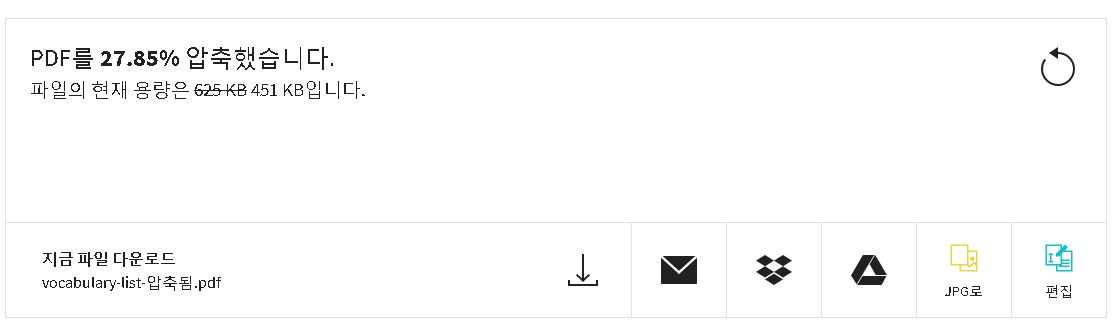 다만 기존의 pdf파일이 이미 저용량이라면 더 이상 압축이 이뤄지지 않을 수 있구요. 암호가 걸려있다면 pdf 용량 줄이기 온라인 기능이 동작되지 않습니다. 압축이 정상적으로 이뤄진다면 용량이 감소된 파일을 다운로드 받으실 수 있습니다.