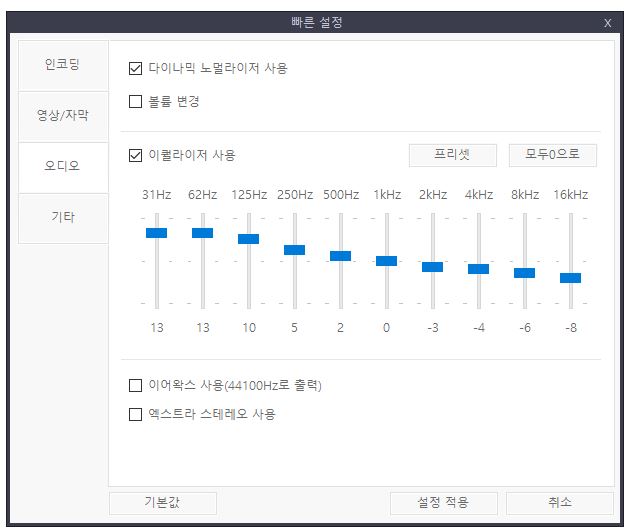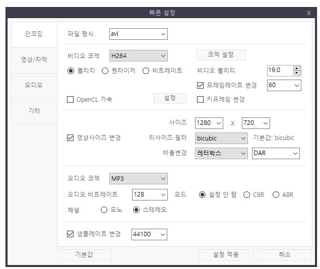 샤나인코더 프리셋에 있는 설정을 그대로 이용하거나 아니시면 빠른 설정으로 세팅을 변경해보시기 바랍니다. 인코딩, 영상/자막, 오디오, 기타 옵션을 통해 여러가지 항목을 자유롭게 바꾸실 수 있네요.