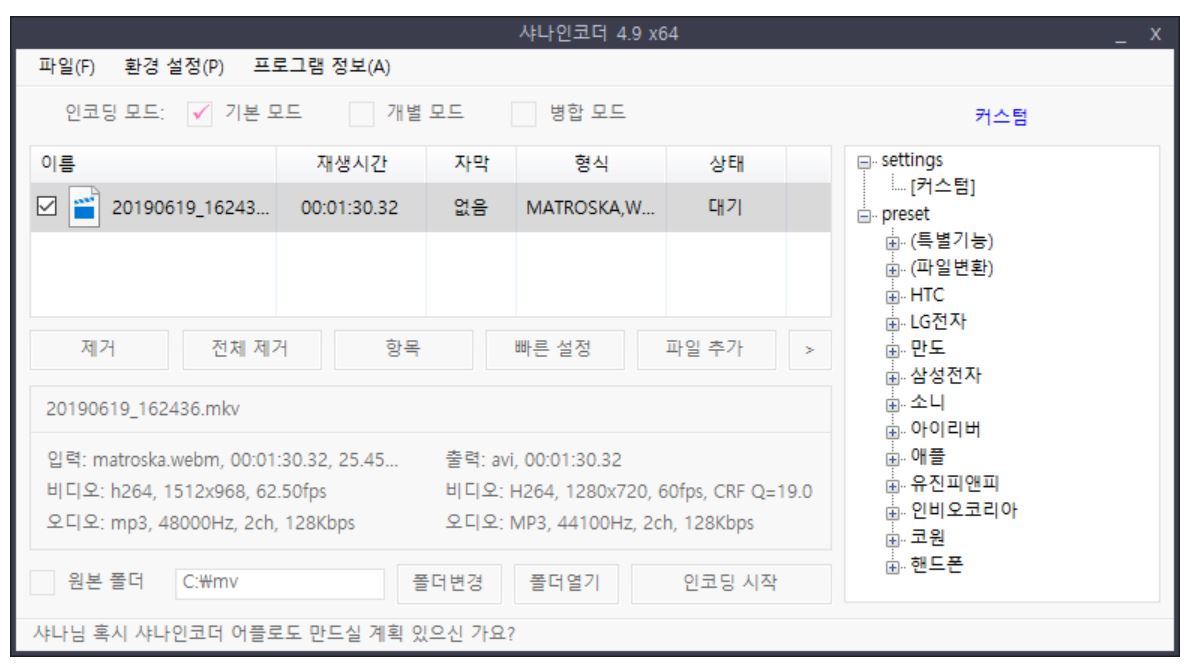이제 프로그램을 실행시켜 샤나인코더 다운로드 및 설치가 정상적으로 이뤄져 사용이 되는지 확인해보세요. 기본 인터페이스에서는 상단에 메뉴, 중단에 파일 옵션확인, 우측에 프리셋 세팅을 확인 가능합니다.