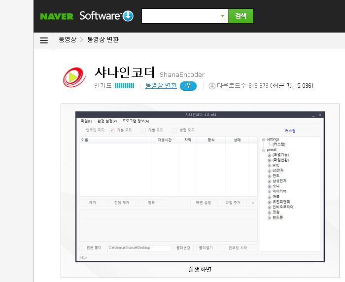 더불어 네이버 소프트웨어에도 등록되어 있기 때문에 검색을 통해서 찾으신 후 받으실 수도 있습니다. 현 시점에서 동영상 변환 부분에서 샤나인코더 다운로드는 1위를 기록할 정도로 인기 인코더 소프트웨어인 것이 확인 되네요.