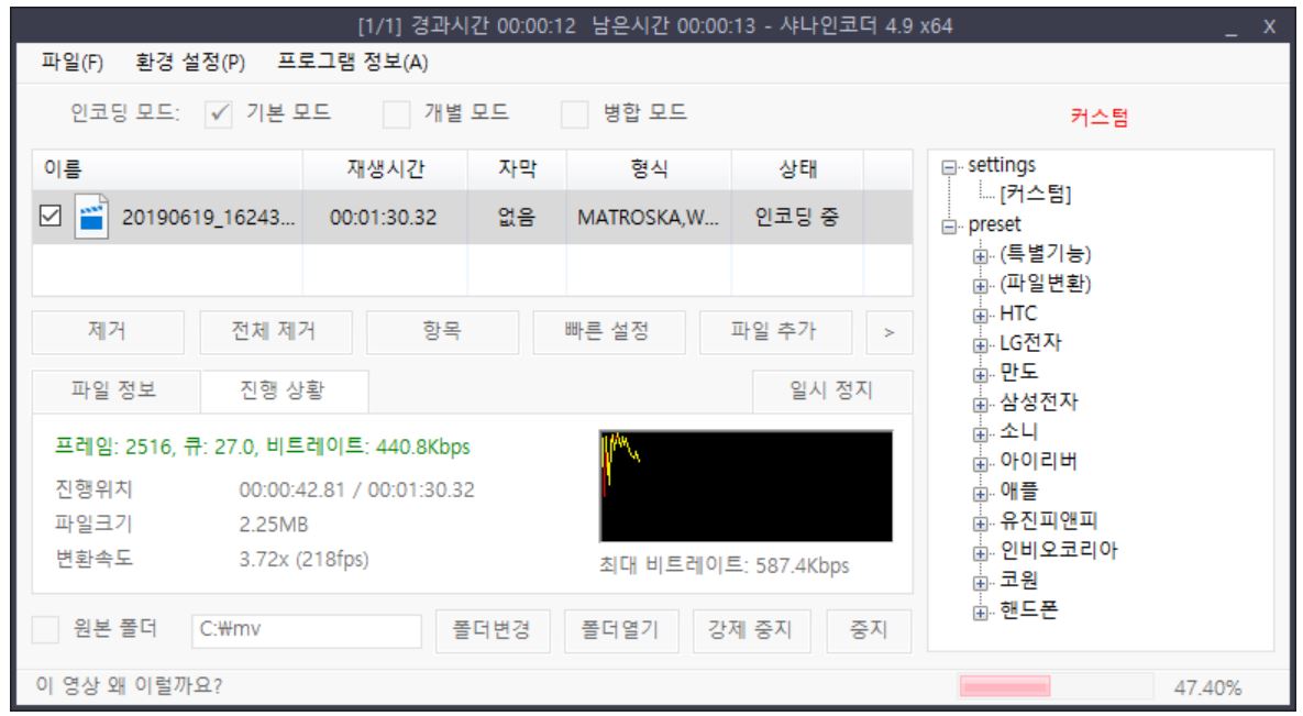 원하는 형태로 바꾸기가 완료되셨다면 이제 인코딩을 진행하여 동영상 변환작업을 진행가능합니다. 이외에도 샤나인코더 다운로드 프로그램은 구간설정 및 영상잘라내기, 병합모드도 지원하니 이용해보시면 나쁘지 않겠죠?