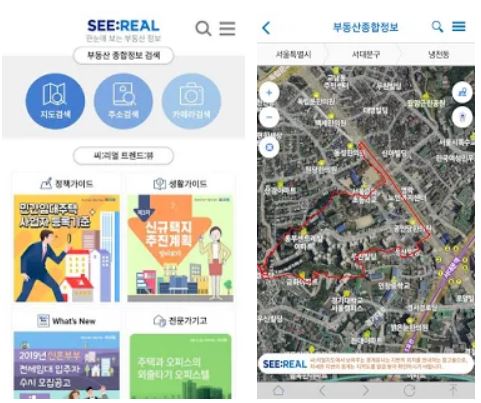 모바일 어플리케이션으로 제공하는 씨리얼 앱 역시 온나라부동산정보 홈페이지와 같이 부동산 생활에 대한 정보, 정책가이드, 종합정보 조회가 가능한데요. 지도, 증강현실을 통한 상세정보 확인 서비스가 길거리를 돌아다니며 토지정보를 확인하는데 있어 도움이 많이 되는 것 같습니다.