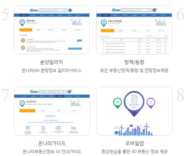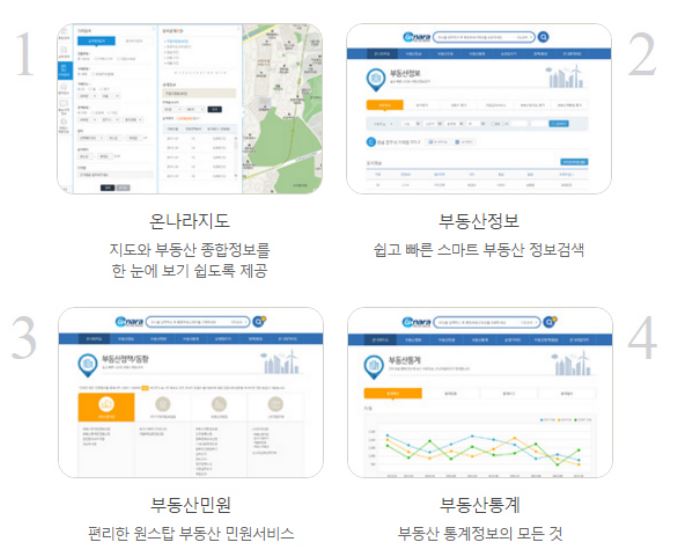 특히 브라우저를 통해 누구나 접속을 하시는 온나라부동산정보 홈페이지에서는 전국의 토지, 주택 등에 대한 가격 정보, 이용규제, 토지이용계획확인서 등을 인터넷으로 쉽게 확인하도록 도와주는데요. 12개 부동산관련 기관과 50여종의 부동산 정보와 공간정보 그리고 통계정보를 한 곳에서 쉽게 볼 수 있어 좋은 것 같습니다.