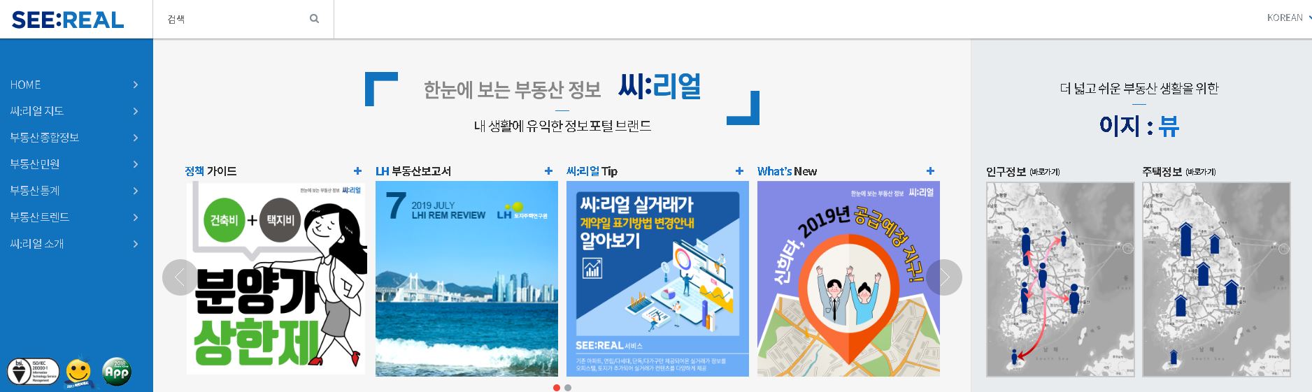 씨:리얼 부동산 정보 사이트의 접속은 검색을 통해 들어가실 수도 있구요. seereal.lh.or.kr를 통해 브라우저에서 직접 접속도 가능합니다. 바로 메인페이지부터 시선을 자극하는 정보들이 보여서 관심이 많으시다면 시선이 멈출 줄 모를 것 같아요.