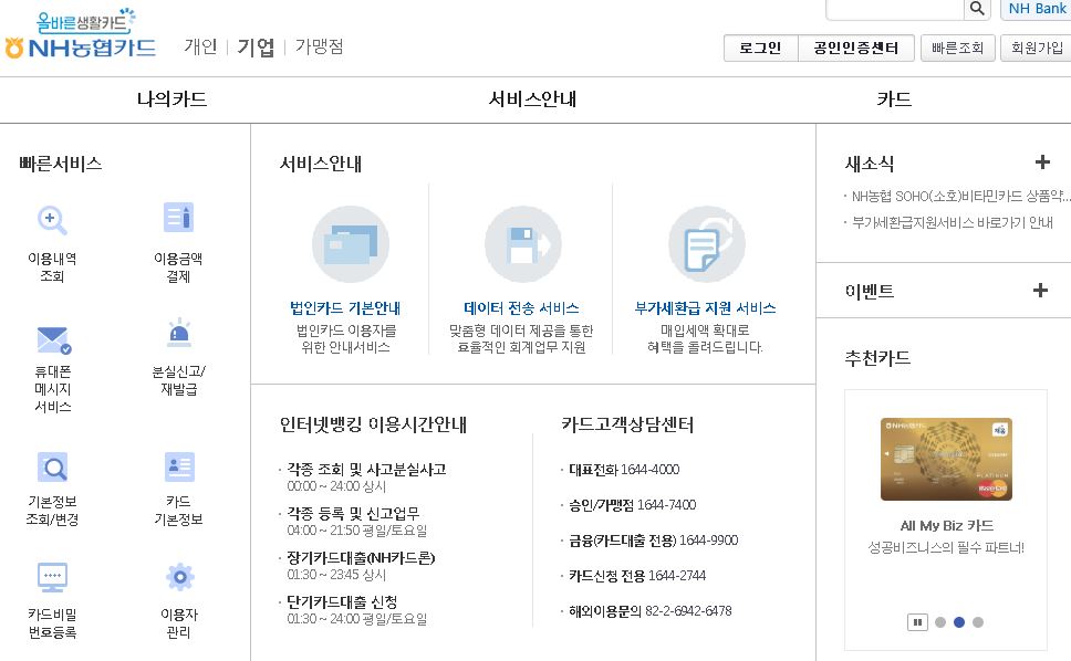 특히 NH농협카드 홈페이지는 개인, 기업, 가맹점에 따라 조회할 수 있는 서비스가 달라지는데요. 개인카드와 달리 기업 같은 경우 법인카드의 이용에 따라 부가세 환급에 따른 지원 서비스가 추가로 제공됩니다.