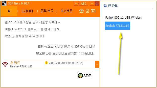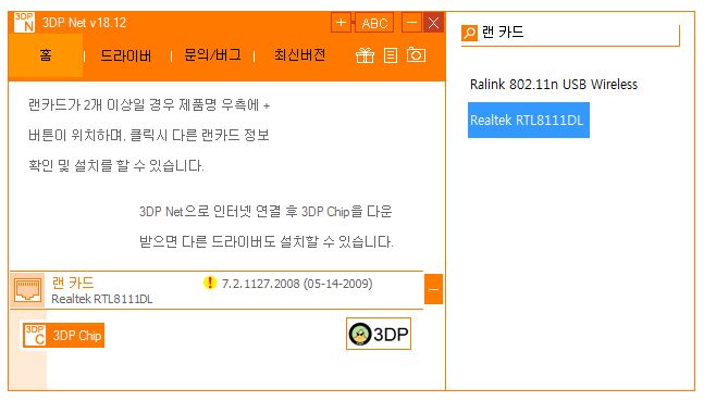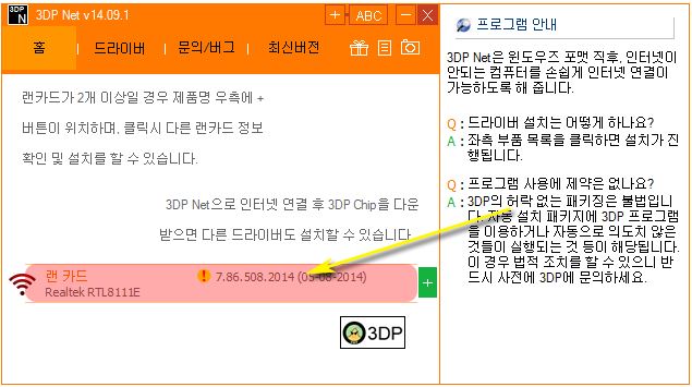 사용법은 자동으로 감지한 랜카드를 3dp net을 통해 확인하시면 되는데요. 만약에 구버전이 설치되어 업데이트가 필요하다면 느낌표가 나올겁니다. 그러면 이제 원하는 최신 네트워크 소프트웨어를 받으셔야 하는데요.