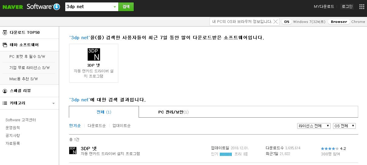 기능도 단순 네트워크 드라이버를 자동감지하고 설치할 수 있는 페이지로의 연결만 지원하기에 사용하시기 어렵지 않은 3dp net인데요. 다운로드법도 추가로 말하면 네이버 소프트웨어에서도 찾아서 받기가 가능합니다.