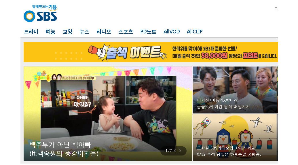 그리고 가장 쉽게 찾아볼 수 있는 곳은 공영방송사인 SBS, MBC, KBS인데요. 해당 홈페이지로 이동을 해보시면 방송사에서 제공하는 편성표 프로그램들을 확인하실수가 있었습니다. 또한 로그인을 하시게 되면 무료티비로 온에어는 물론 다시보기로 감상할 수 있는 프로그램들이 있었습니다.