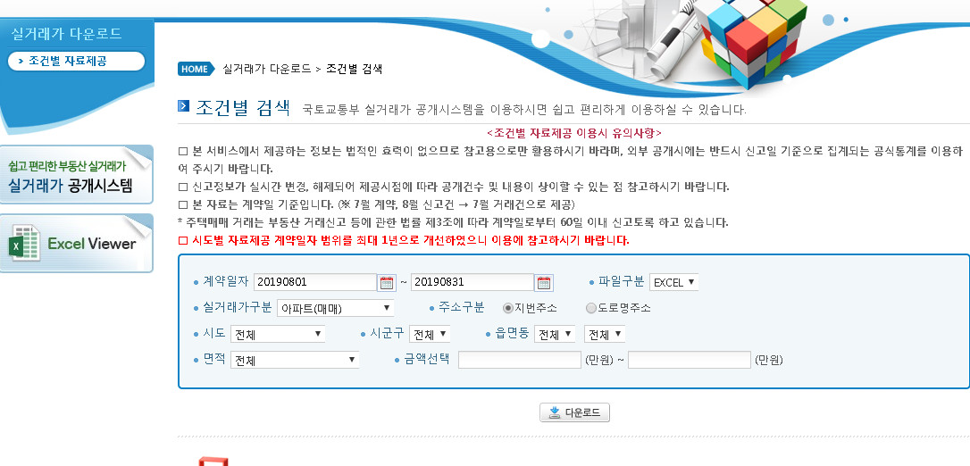 그리고 홈페이지 상단에 보이는 메뉴들 중에서 실거래가 자료제공을 선택해보시면 조건별로 찾아보실수 있고 이런 정보들을 다운로드를 해볼수도 있었습니다. 이 곳에서 제공하는 정보는 법적인 효력이 없어 아파트실거래가조회 참고용으로만 활용을 해주시면 되겠습니다.