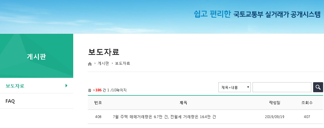 이렇게 국토부 아파트 실거래가를 알아보시다가 문득 궁금한 사항들이나 보도자료들을 확인하고 싶으실때가 있습니다. 그럴때에는 게시판이 따로 있어서 확인을 할 수가 있었는데요. 찾아보는 방법은 홈페이지 상단에 메뉴가 있으니 이를 통해서 확인을 해주시면 되겠습니다.