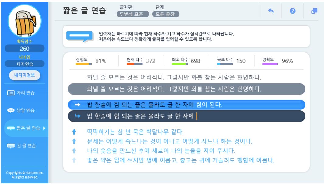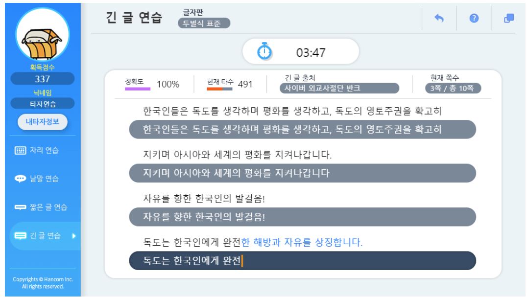 온라인용으로 별도의 로그인을 하시지 않아도 편리하게 무료 한컴타자연습하기가 가능해요. 기존버전과 같이 한글과 영어 모두 기본자리, 낱말, 짧은글, 긴글 모두 연습이 가능하여 자신의 타수를 확인하실 수 있습니다.