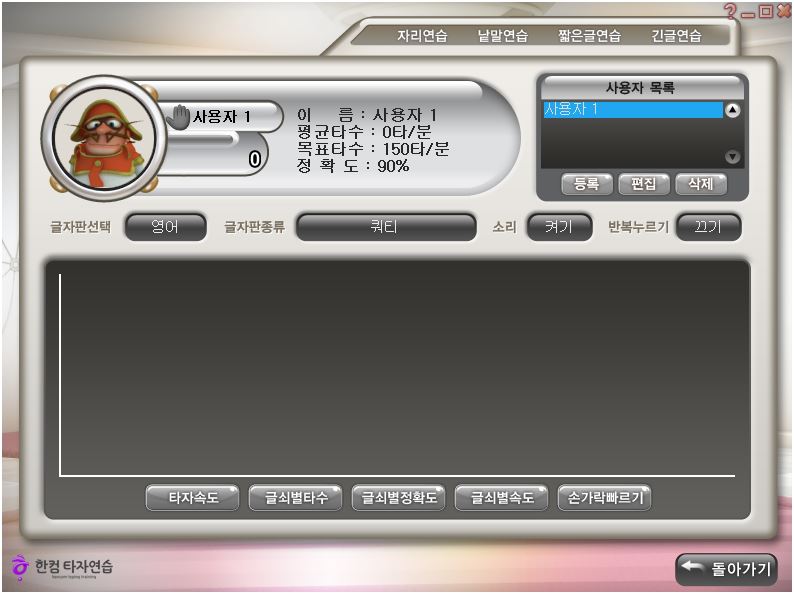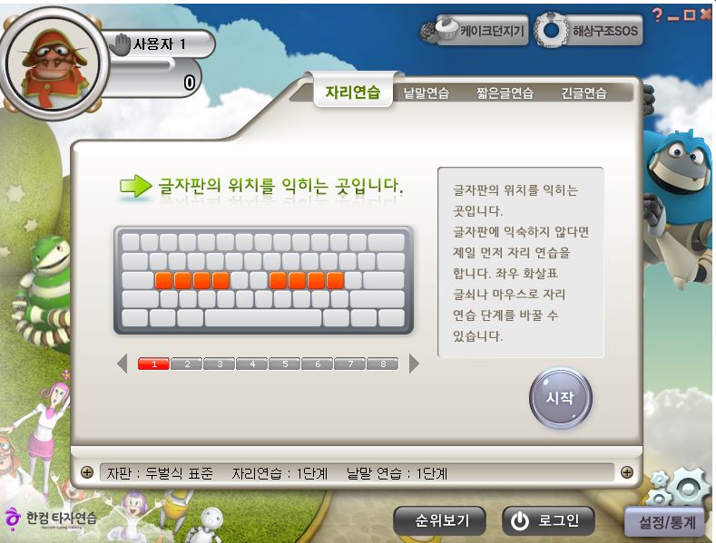 프로그램으로 제공하는 버전 역시 한컴타자연습 바로가기로 웹에서 하실 수 있는 것과 같은 기능을 제공하는데요. 자리연습, 낱말연습, 짧은글연습, 긴글연습을 하실 수 있습니다. 더불어 설정/통계에서 영문으로 변환과 기록확인도 할 수 있구요.
