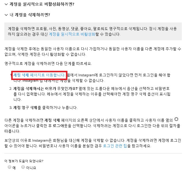처음 이동을 해보면 해당 내용들이 펼쳐져 있지 않는데요. 우리가 알아보는 것은 인스타그램 탈퇴방법이니 계정 삭제대한 내용을 선택해보시면 그림처럼 그에 대한 내용을 확인할 수 있습니다. 그 중 삭제 페이지로 이동하는 것을 선택해주시면 되겠습니다.