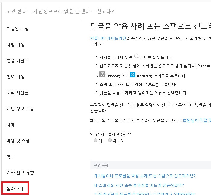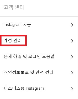 이제 인스타그램 고객센터로 이동을 하시면 왼쪽 하단 부분에 돌아가기라고 되어있는 곳이 있는데요. 이 것을 선택해서 고객센터 초기화면으로 넘어가면 계정 관리에 대한 메뉴가 있으니 이를 선택해주시기 바랍니다.