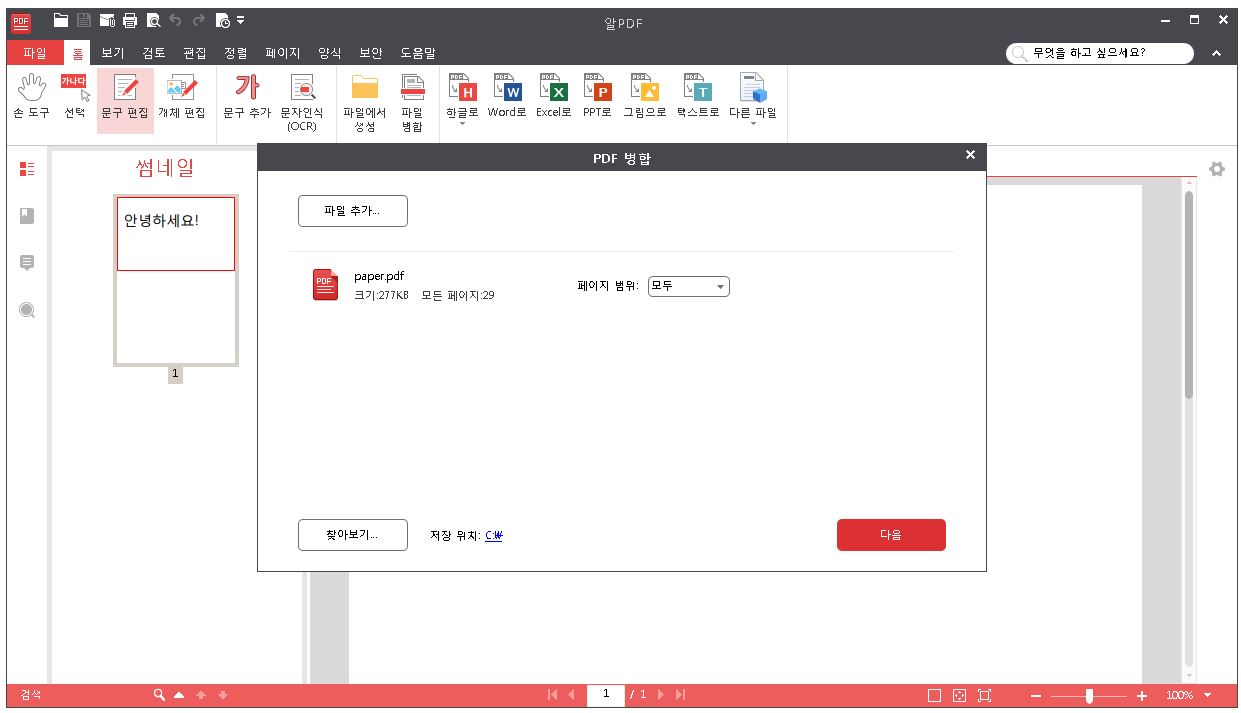 그리고 많이들 이용하신다 했던 pdf를 한글파일로 변환 기능도 무사히 수행되는 것을 확인하였구요. 그 밖에도 파일 합치기와 쪼개기도 정상적으로 알pdf 소프트웨어로 하실 수 있었습니다.