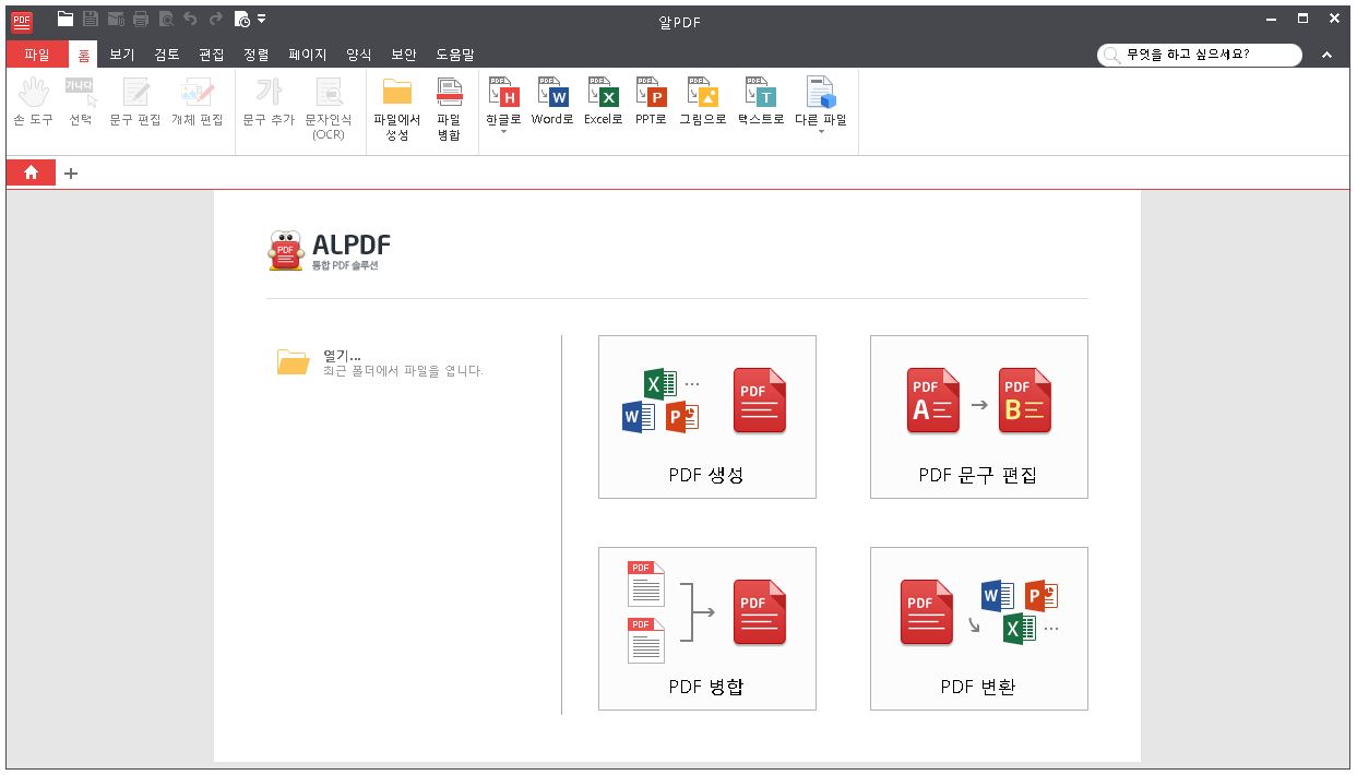 설치된 알pdf 무료로 다운로드 파일 프로그램을 열어서 사용해보도록 하겠습니다. 열어보시면 간단히 도구 박스 로드를 진행하신 후에 메인화면을 확인하실 수 있습니다.