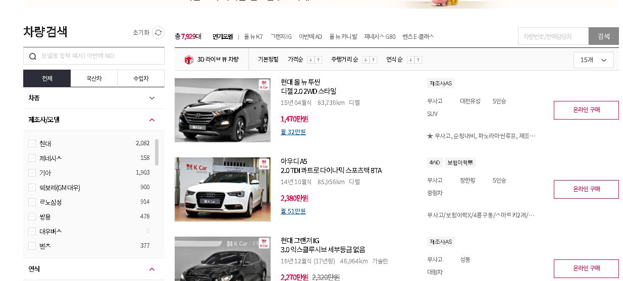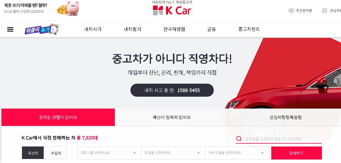 그 외에 직영으로 운영이 되고 있는 곳인 K Car가 있는데요. 과거에는 sk엔카 직영몰이였으나 현재는 분리되었다고 합니다. 직접 중고차를 구입 및 판매가 제공되는 곳이라는 특징이 있는 곳이에요.