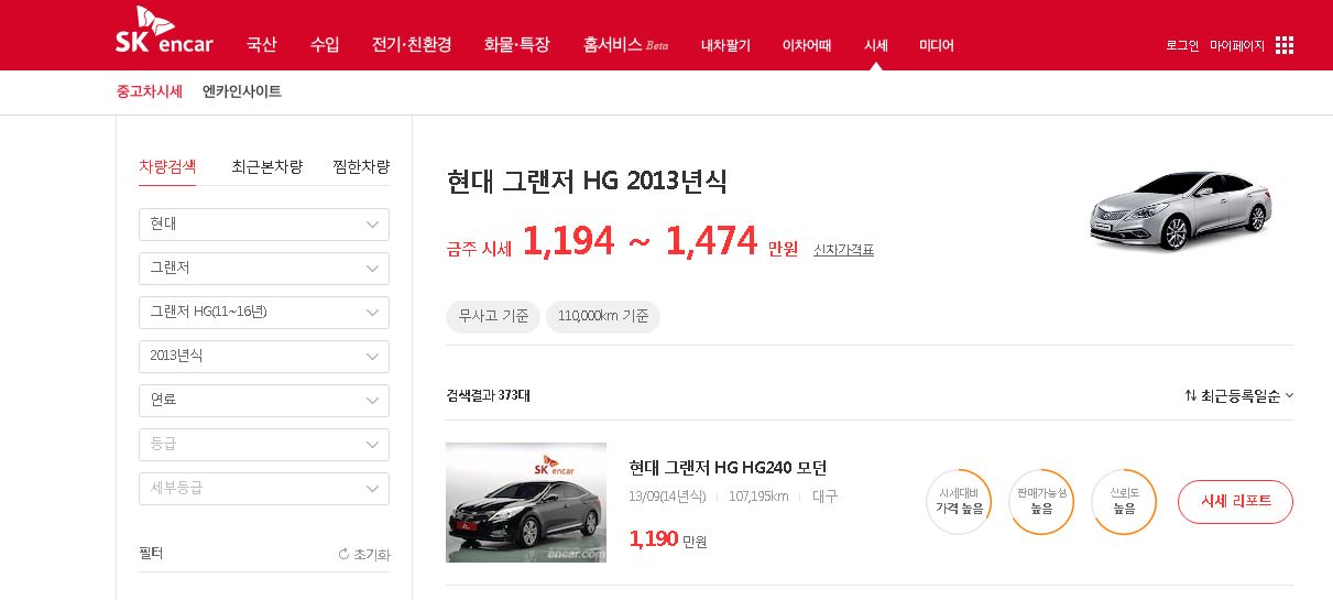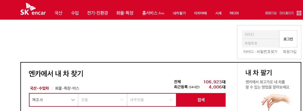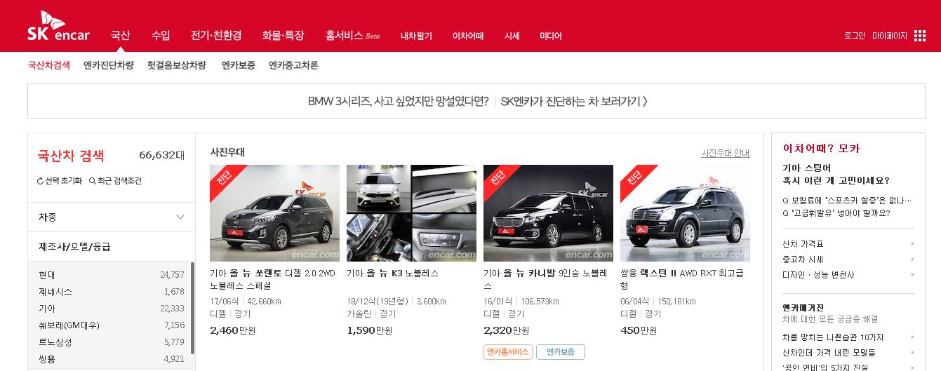 첫 번째로 국내에서 가장 많은 중고자동차 매물수를 기록하는 곳은 SK엔카로써 국산 및 수입 자동차에 대한 시세와 더불어 매매관련된 많은 정보가 확인 가능합니다. 많은 분들이 이용하는 중고 자동차 매매사이트인만큼 믿을 수 있는 곳이지 않나 싶네요.