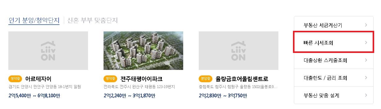 홈페이지를 통하여 국민은행 아파트 시세를 조회하는 방법은 지도를 통해서 확인하는 방법도 있지만 화면 중단에 있는 '빠른 시세조회'를 이용하시는게 편리한데요.
