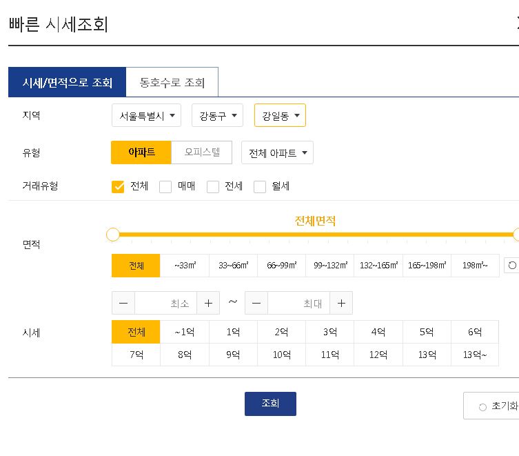 지역, 거래유형, 면적, 가격을 결정해주시고 조회를 하게 되면 전국에서 지정하신 위치에 대하여 KB 국민은행 아파트 시세조회가 가능합니다.