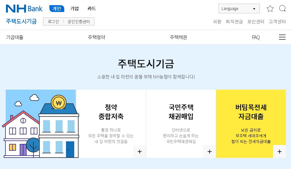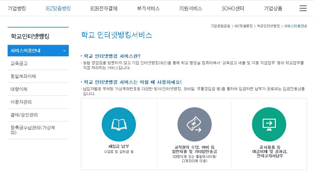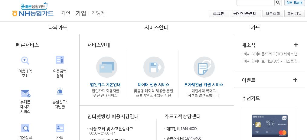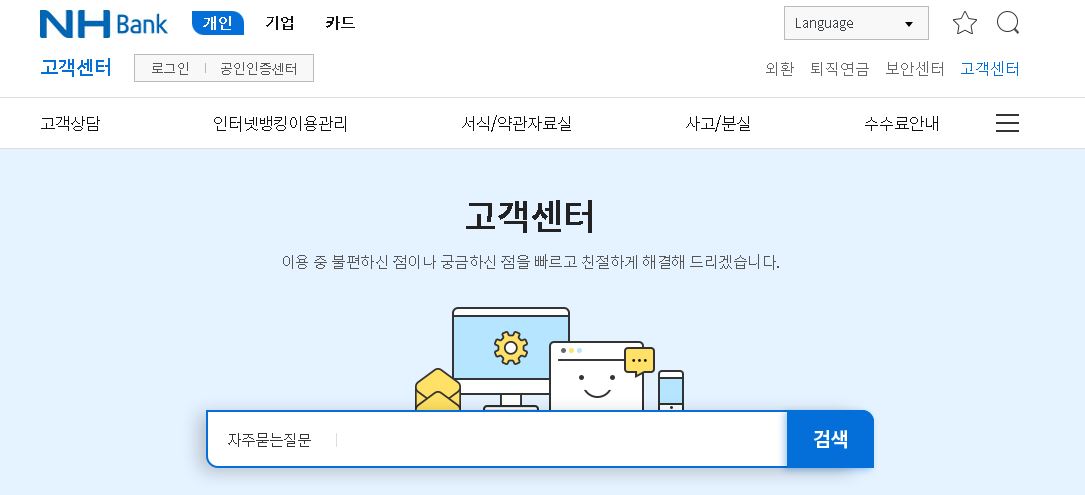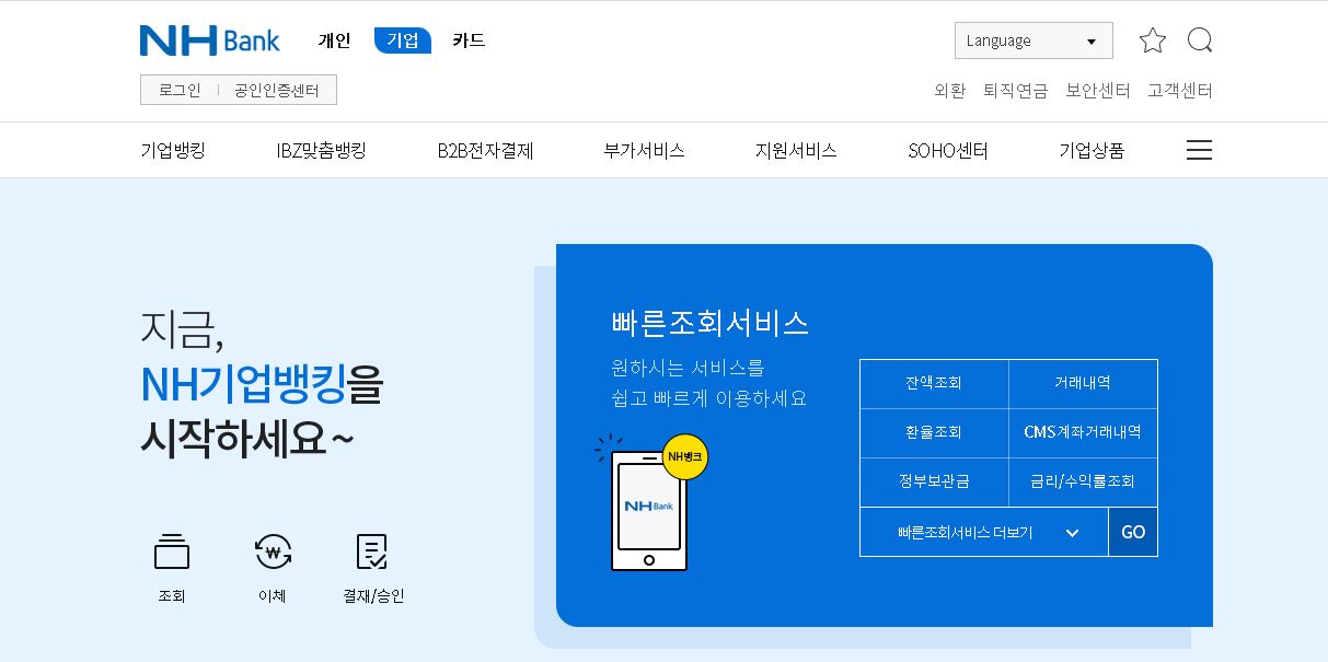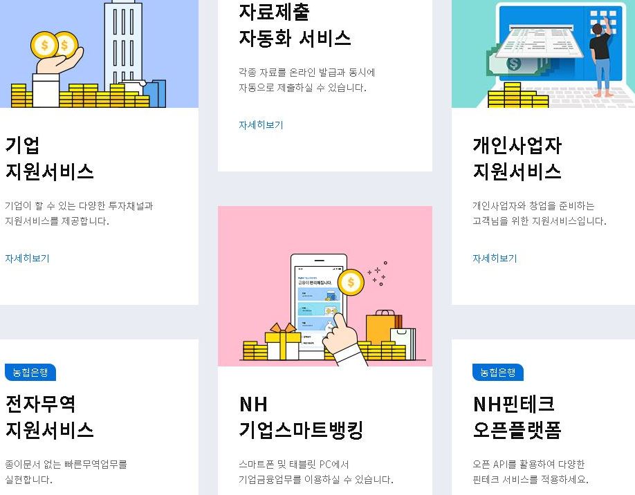 들어가보시면 개인인터넷뱅킹과 더불어 기업인터넷뱅킹 마지막으로 농협카드 페이지도 확인하실 수 있는데요. 모두 농협 인터넷뱅킹과 밀접한 관계가 있어서 그런지 한데 묶어져 있네요.