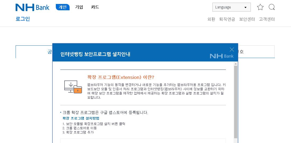 기본적으로 농협 인터넷뱅킹 은행 서비스를 이용하시기 위하여 홈페이지 바로가기 후에 진행하다보면 보안프로그램은 자동으로 설치가 될 수 밖에 없는 구조 인 것 같아요.