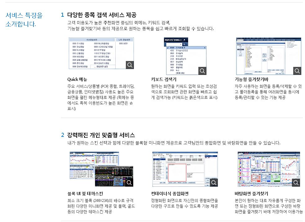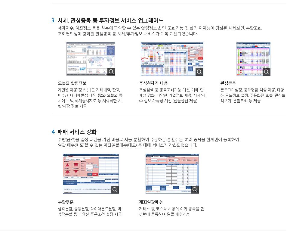 그리고 모바일 같은 경우는 스토어를 이용하셔서 mhts 애플리케이션을 받아서 삼성증권금융거래를 하시면 됩니다. 기본적으로 삼성증권 hts 다운로드의 특징은 개인 맞춤형 서비스와 관심종목 투자정보 제공, 매매 서비스 강화가 있는데요.