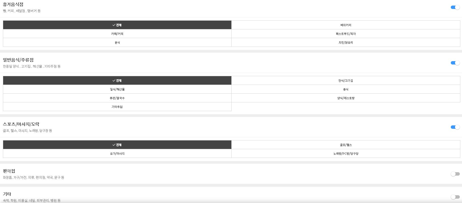 특히 상가와 점포를 찾으시는 분들은 권리금 문제도 있기 때문에 기존에 어떤 용도로 이용을 한 곳인지도 잘 선택을 하셔야 하는데요. 이럴 때 다음 부동산 매물 매매 서비스에서는 지도로 찾기 뿐아니라 업종으로 찾기 기능도 있어서 편리합니다.