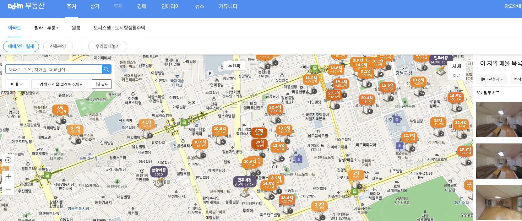 본격적으로 다음 부동산 매물에 대한 정보를 확인해보았는데요. 지도를 통하여 원하는 위치에 따른 매물을 확인하실 수 있게 표시가 되구요. 거기에 여러 옵션을 통하여 원하시는 곳을 찾을 수 있는 서비스를 지원합니다.