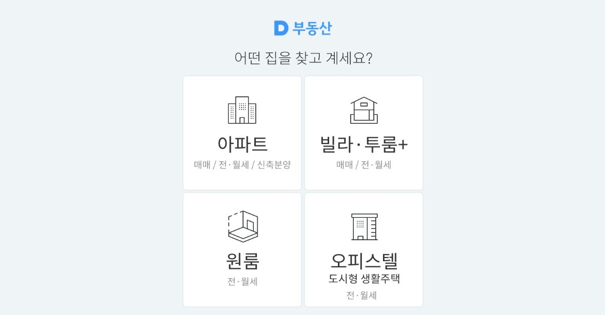 다음 부동산 매물 매매 확인을 위해서 홈페이지인 realty.daum.net에 들어가 보았는데요. 부동산홈에서는 아파트, 빌라/투룸, 원룸, 오피스텔, 상가에 대한 정보를 확인하실 수 있도록 메인에서 보여주었습니다.