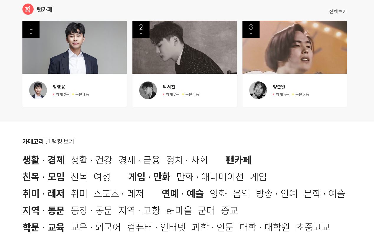 daum카페에서는 카테고리별/랭킹별로 카페사이트가 분류되어 쉽게 검색을 하실 수 있게 도와줍니다. 더불어 팬클럽카페 역시 따로 분류가 되어 있는 것 같네요.