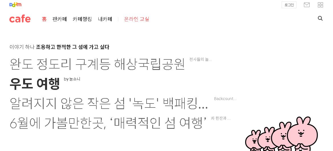 홈페이지 주소는 cafe.daum.net로 외우기 어렵지 않기 때문에 확인을 해두시고 인터넷 브라우저에 직접 입력을 하고 들어가시면 됩니다. 이 방법이 귀찮다면 다음 홈페이지에서 카페를 찾는 방법을 이용하는데요.
