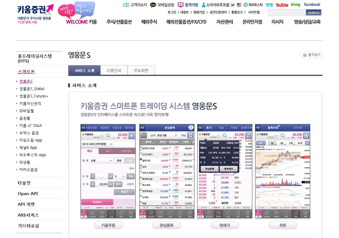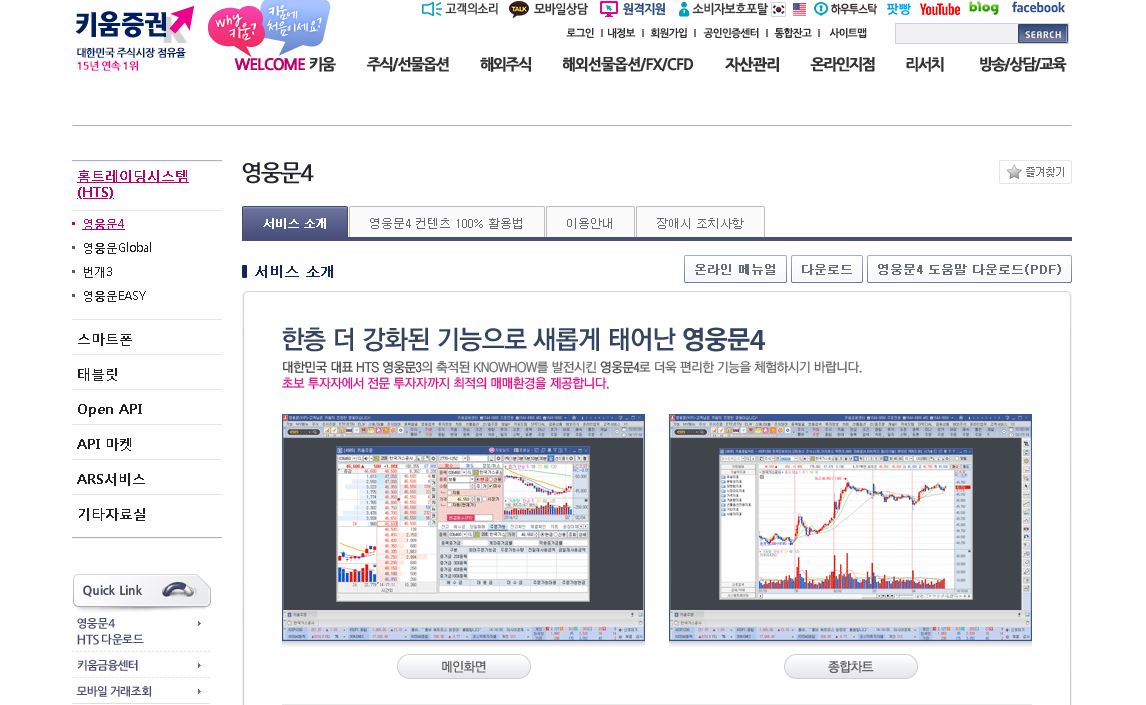 계정까지 만드셨으면 이제 거래를 위해서 HTS 프로그램을 받으셔야 합니다. 홈 트레이딩 시스템인 HTS같은 경우는 국내장용, 해외용 그리고 모바일용으로 따로 제공이 되어지고 있습니다. (모바일앱도 국내것과 해외것이 따로 있습니다.)