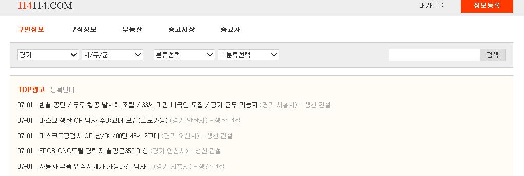 특히나 구인정보와 구직정보를 구하시는 분들이 114114구인구직 바로가기를 통하여 114114.com 홈페이지에 접근을 많이 하시구요. 그 외에 중고시장과 부동산 그리고 중고차 관련된 지역정보도 확인을 하실 수 있습니다.