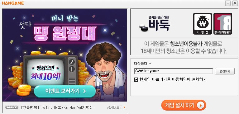 본격적으로 한게임 바둑 바로가기 홈페이지로 들어오셨으면 이제 대국실 입장하기로 게임을 설치해주시면 되는데요. 여기에서는 한게임 바로가기를 바탕화면에 설치하기를 선택 가능합니다.