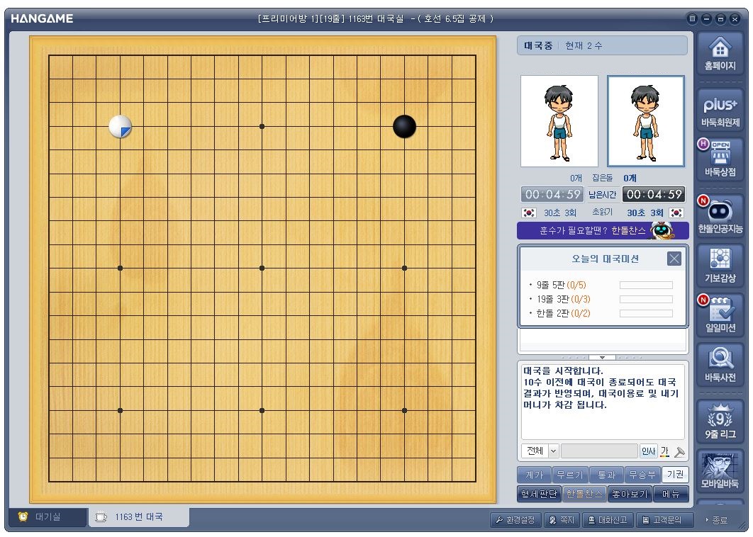 자신의 급수에 따라서 바둑두기를 시작하였으면 이제 상대방과 치열한 수읽기를 하면 됩니다. 상대는 빨리 찾아지며 경기는 스피드하게 진행이 되어집니다.