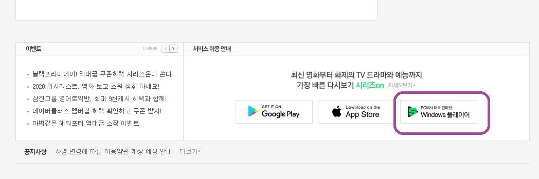홈페이지 하단 배너에 보시면 서비스 이용 안내에 pc에서 더욱 편리한 windows 플레이어로 네이버 시리즈온 플레이어 다운로드가 가능합니다.