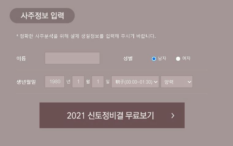 덕분에 여러분은 농협 무료운세를 바탕으로 2021년에 대한 정통운세, 신토정비결, 벼락부자비법에 대한 정보를 획득할 수 있게 되었습니다. 이러한 정보는 간단한 사주만 입력하면 되기 때문에 무척이나 심플합니다.