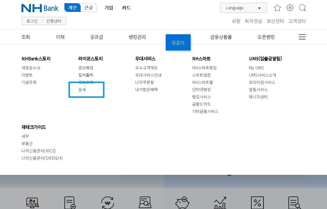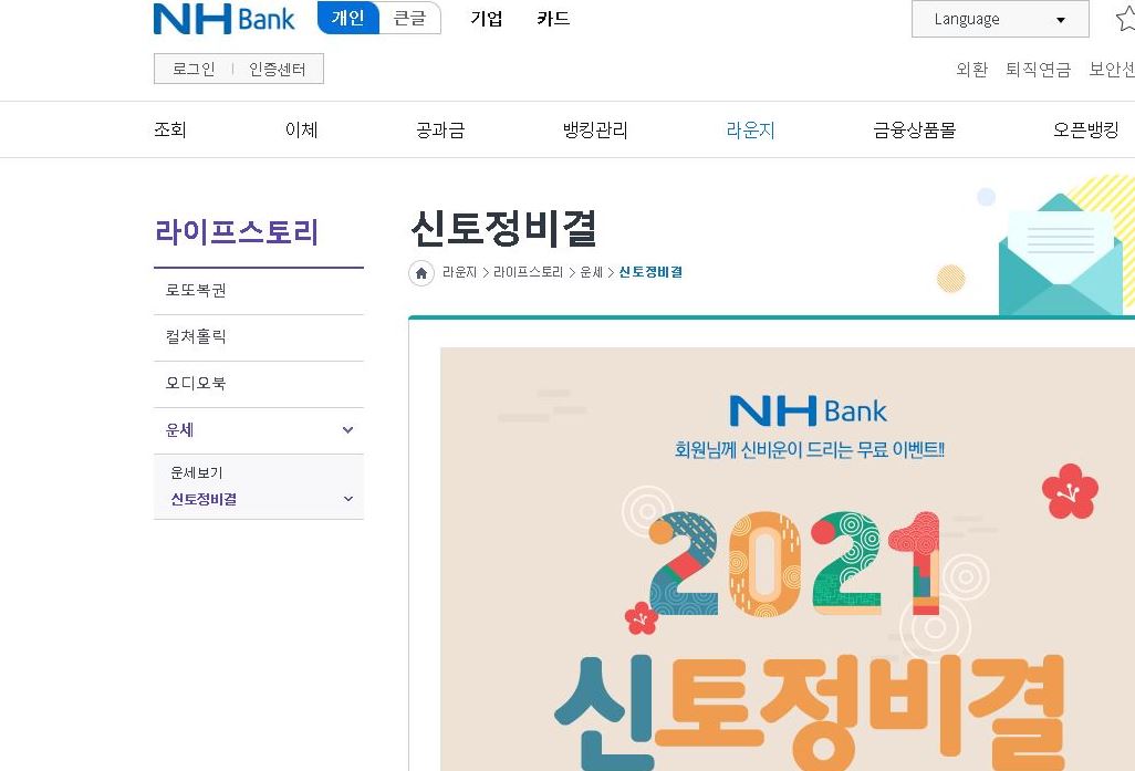 서비스 이용방법 같은 경우는 농협 인터넷 뱅킹 홈페이지를 통해서 시작하실 수 있는데요. 사이트에 들어가신 이 후에 라운지 -> 라이프스토리 -> 운세를 바탕으로 확인을 하시면 됩니다.