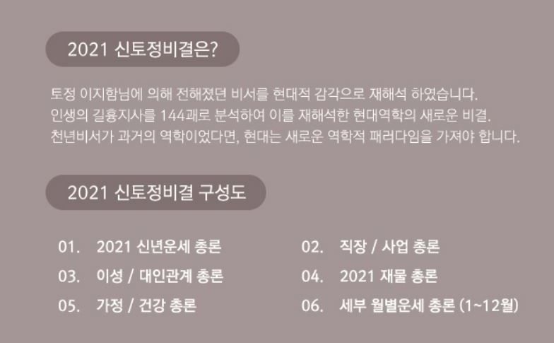 종합적인 운세를 제공하는 2021신토정비결에서는 토정 이지함 님의 비서를 바탕으로 현대적 패러다임하에 재해석한 내용을 확인할 수 있습니다. 때문에 이를 바탕으로 최신 운세를 확인하는데 좋습니다.