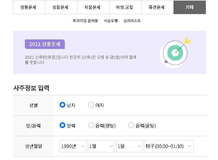 때문에 얼마전까지는 2020년 경자년 정통신년운세에 대하여 볼 수 있었습니다. 그리고 이제 2021년 신축년이 다가오자 여기에 대한 토정비결이 업데이트가 되어서 확인할 수 있게 되었답니다.