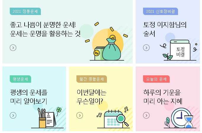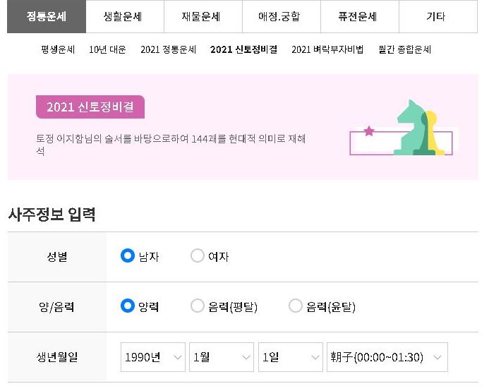 나오는 정보는 2021 신년운세 총론, 직장/사업총론, 이성/대인관계 총론, 2021 재물 총론, 가정/건강 총론, 세부 월별운세 총론이 확인이 된다고 합니다.