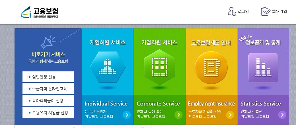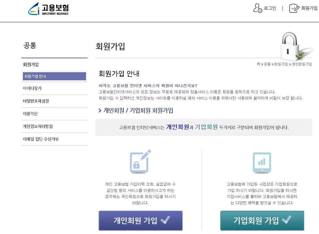 가입을 위해서는 우선적으로 고용보험 홈페이지에 접속을 하시구요. 회원가입 메뉴를 통하여 가입절차에 따라서 진행을 하시면 됩니다. 고용보험의 인터넷서비스는 개인회원과 기업회원으로 구분이 되어진다고 하네요.