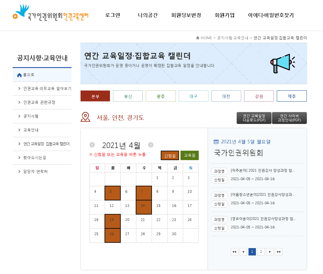 인권교육센터 홈페이지에서는 교육일정과 사이버교육에 전반적인 내용이 확인됩니다. 따라서 교육을 들으셔야하는 대상자라면 홈페이지에 접속을 해보세요.