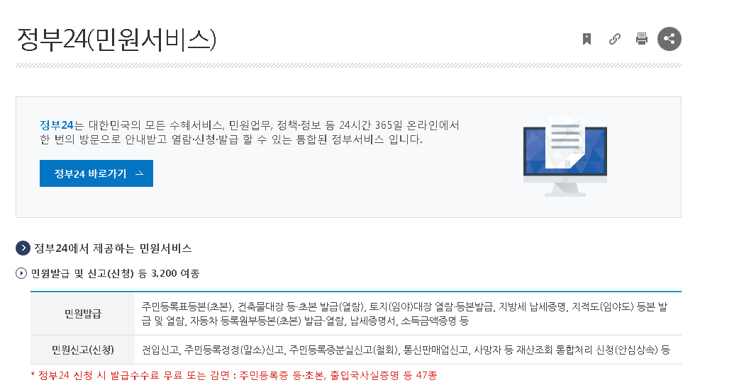 행정기관에 방문을 하여 작업을 하는 수고를 덜고 시간과 비용을 절약할 수 있도록 정부에서는 민원을 처리할 수 있는 정부24시 홈페이지를 운영하고 있습니다.
