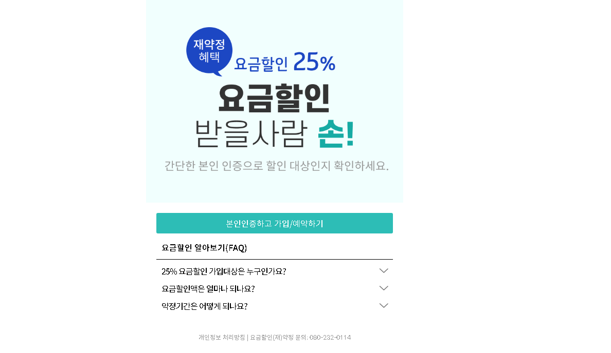 25% 요금할인 가입대상은 누구인가요? - 공시지원금을 받지 않았거나, 받았더라도 24개월이 경과된 중고/자급 단말 이용고객 * 온라인 가입/예약은 개인고객만 가능하며, 법인/청소년 고객은 고객