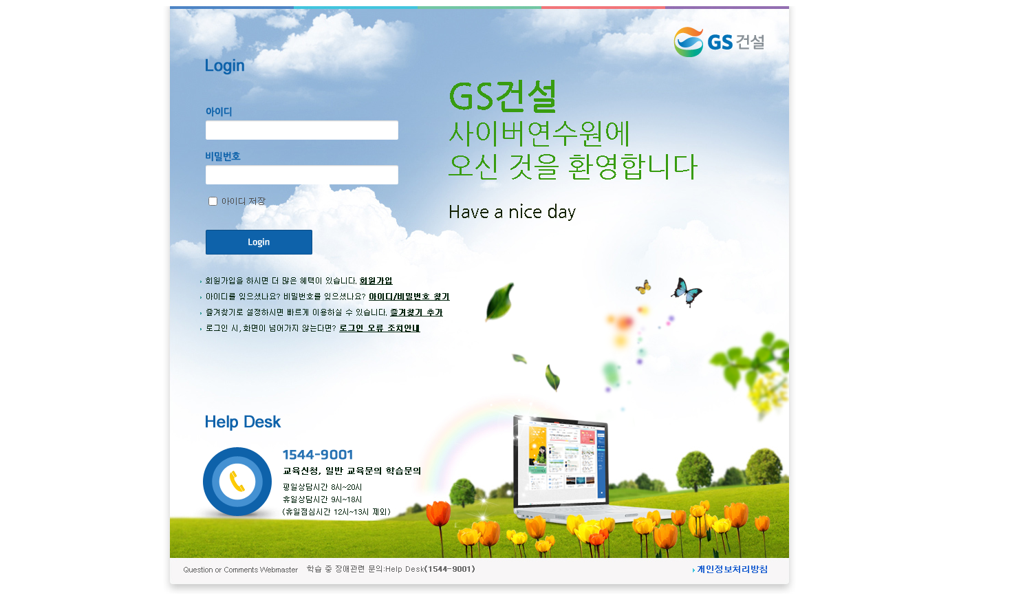 GS건설의 사이버연수원에서는 교육신청 및 교육문의, 학습문의를 진행하실 수 있다고 합니다. 회원가입 후에 아이디와 패스워드를 통하여 로그인을 하시면 이용가능하다고 하네요.