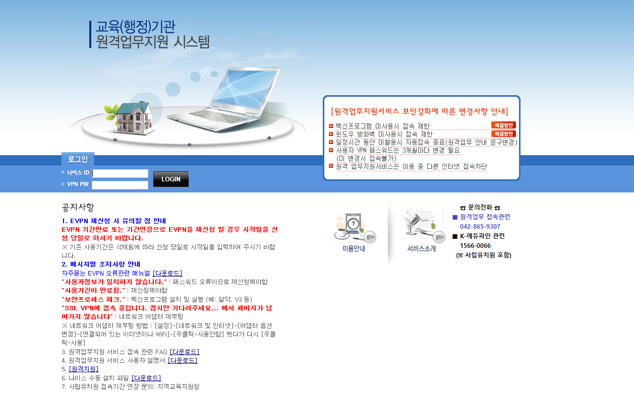 대전교육청의 원격업무를 지원하는 시스템 홈페이지입니다. 인터넷 익스플로러를 통하여 접속을 하시고 보안프로그램을 설치하신 이후에 이용하시길 바랍니다.